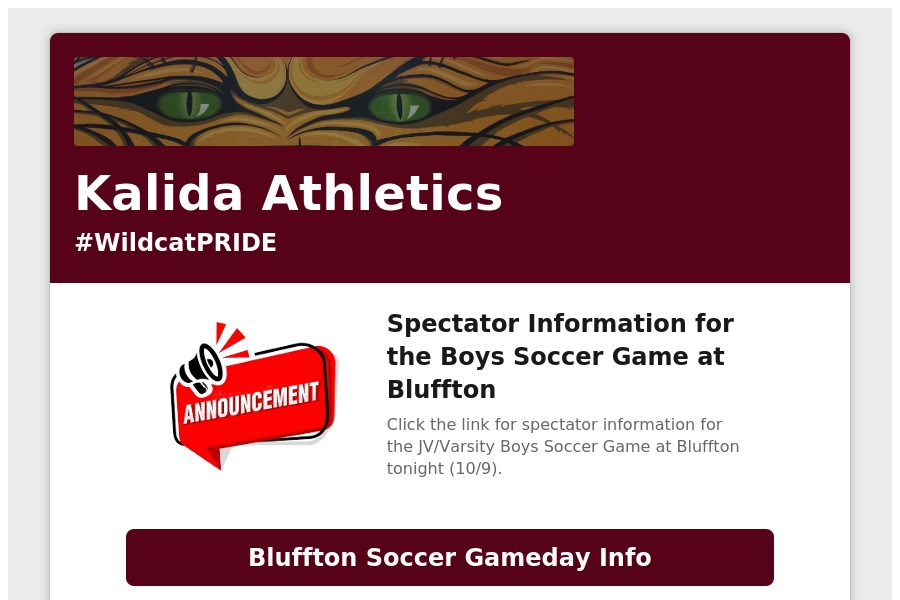 The Varsity Girls Soccer game on Thursday (10/9) vs. Columbus Grove will now start at 7pm. Senior Night will take place at 6:40pm.